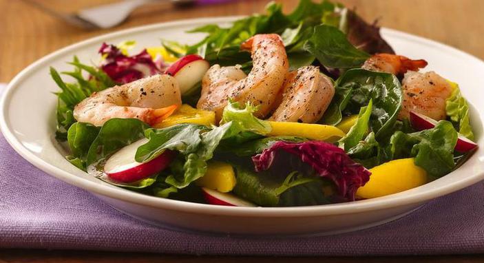 En un tazón hondo grande, agrega la mezcla para ensalada, los mangos, los rábanos y el aderezo. Divide la ensalada en 4 platos; coloca en cada plato 5 camarones.