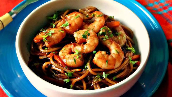 PASO 4 Añade la mezcla de salsa de soya a los camarones y el espagueti escurrido. Deja cocinar por unos 5 minutos a fuego lento hasta que la salsa espese. Retira del fuego. Para servir, espolvorea con unas cuantas hojuelas de chile de árbol. ¡Buen provecho!